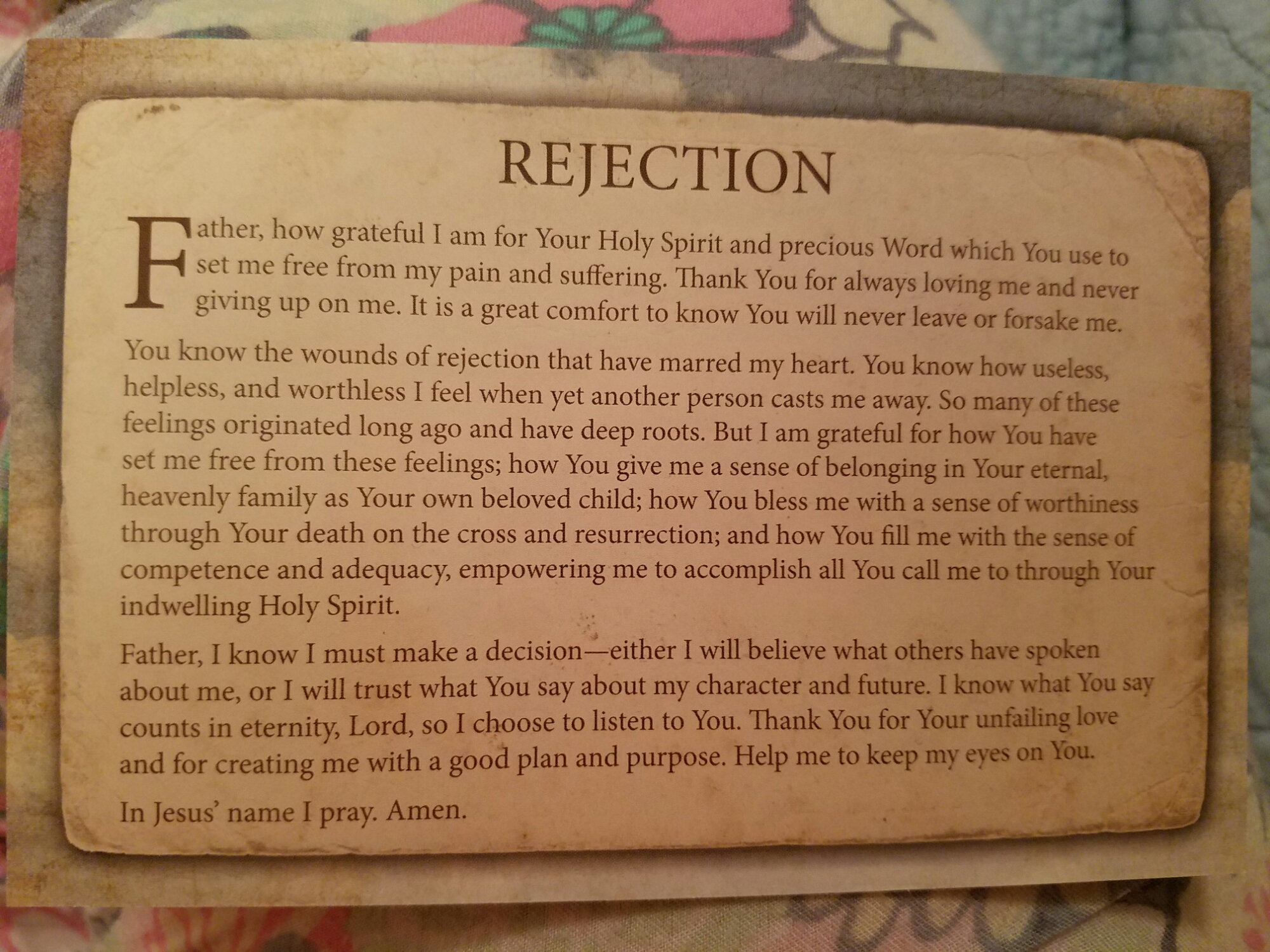 I have overcome all feelings of rejection, anger, and unforgiveness because I surrender these feelings to the cross. “Nay, in all these things we are more than conquerors through him that loved us.”~Romans 8:37~